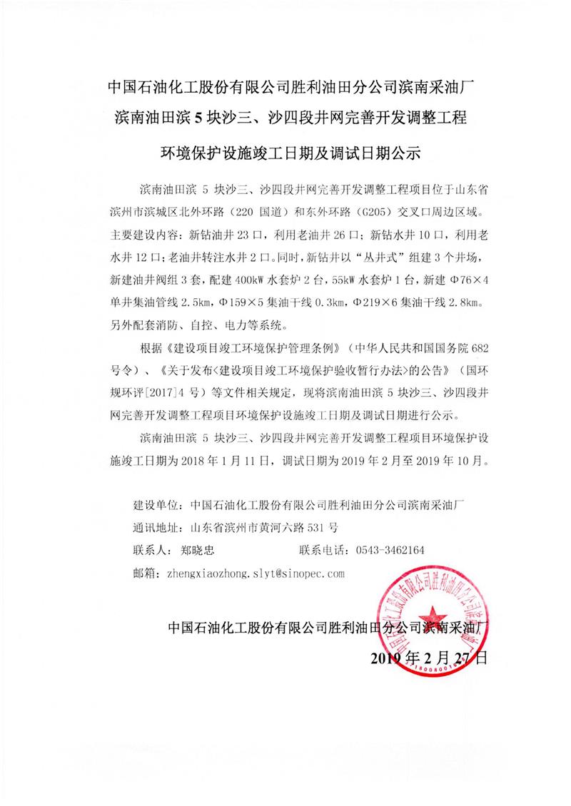 中國石油化工股份有限公司勝利油田分公司濱南采油廠濱5塊沙三、四段井網(wǎng)完善開發(fā)調(diào)整工程環(huán)境保護(hù)設(shè)施竣工日期及調(diào)試日期公示
