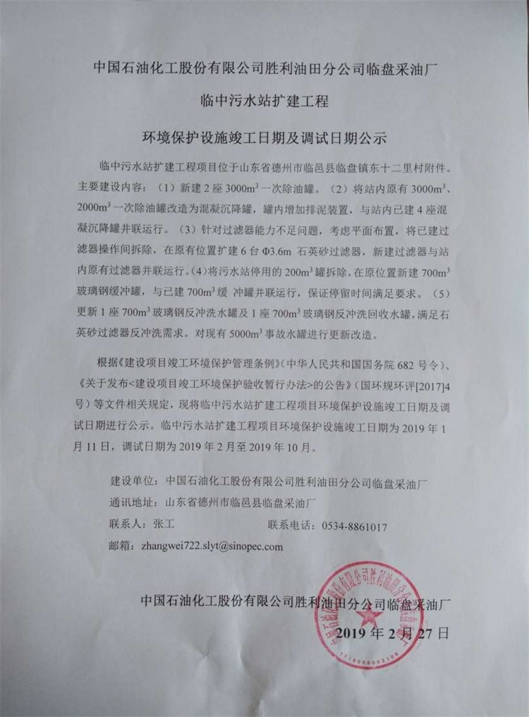 中國石油化工股份有限公司勝利油田分公司臨盤采油廠臨中污水站擴建工程環(huán)境保護設施竣工日期及調試日期公示